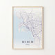 En fantastisk konsttryck av San Diego-kartan renderad i en mjuk pastelldrömfärgs palett. Varje gata, motorväg och vattenled är kartlagd i fin detalj mot en mjuk pastellbakgrund. Perfekt som en statementbit för ditt hem, kontor eller som en present till alla San Dieganer.
