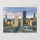 Bilden visar en panoramisk vy av San Francisco skyline vid solnedgången. Flera skyscraper dominerar scenen, bland annat Transamerica Pyramid och Salesforce Torn. Byggnad har slagits i det varma, gyllene ljuset av sol, vilket skapar en pulserande kontrast till blå himmel och spridda moln.
