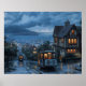 Upplev charmen från San Francisco vid vriden med denna moody poster. Två kabelbilar glider ner på en regn gata, flankerade av viktorianska hus med lysande fönster, medan Alcatraz slumrar över bukten under dramatiska moln. Perfekt för konst älskare, citysslementusiaster och som en unik hemskör eller gåva.