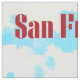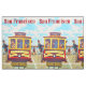 Dags att hoppa på kabelbilen. Den här vintage resor-utskriften skildrar en vagn i San Francisco i Kalifornien. Golden Grind Bridge i bakgrunden.