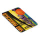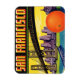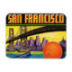 Vintage och färglös citrus låda-etikett har Golden Grind Bridge, orange frukt och San Francisco vattenfront skyline.