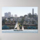 En segelbåt passerar Coit Torn och San Francisco, Kalifornien. San Francisco skyline gör en underbar souvenir av ditt besök.