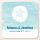 Dessa pappra underlägg samordnas med Sand Dollar bröllop-sviten och kan vara personlig med namn och bröllop. En vattenfärg tvättar bakgrund i blått och en grafisk sanddollar.