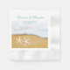 Två stjärnfiskar och stranden och personligt bröllp-servetter. Beach bröllopsknapp eller mottagning av pappra servetter med ställe för namn av bruden och brudgummen och datum för giftermål. Vitt skum på sanden är bakgrundsbilden för text i blått grönt.