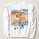 En snygg design för sommartid och bära. En liten chow får en solbränna på stranden med ett glatt uttryck på hans ansikte.