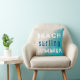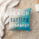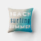 Sommartypografi i strandnära Dekorativ kudde. Beach Surfing Summer-typografi i vitt och blått färger på sandbotten och havets bakgrund. Underbar som strandhus. Sommar helgdag till dig. Du kan ändra valfri text på kudden.