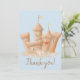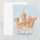 Praktfull illustration av sand slott med text överlägg på ljusblå bakgrund.