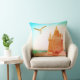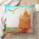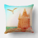 Underbar för Korn! En Fiskmås svävar över ett sandslott med snäckor. Besök Roligt4UDesigns för fler kuddar för ROLIGTAR!