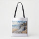 En hypnotisk vy av ett vattenfall som forsar ner på en sandstrand. Havsvågorna sköljer försiktigt mot klipporna under en mjuk blå himmel.
