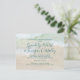 Två sanddollar, strandbröllopsinbjudan i form av vykort för att hålla planeringen enkel och ekonomisk. All text hamnar på framsidan med hjälp av mallar med modern, handskriven stil för namn och tryckt typsnitt. Inkludera information om mottagning och bröllopswebbplats vid behov. Låt gästerna svara online och spara pengar med denna mindre vykortsinbjudan - som behöver mindre porto! Texten är i blågrön färg. Baksidan är tom, med en våt strandbakgrund och två små sanddollar längst ner. Handskriv adresser eller använd adressetiketter.
