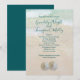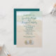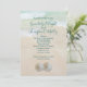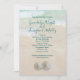 Traditionell formulering, strandbröllopsinbjudan mall med modern handskriven stil för namn. En diskret strandbakgrund av sand och ljust havsgrönt vatten bär blågrön text, med två naturliga sanddollar i botten. Formuleringen börjar med en rad för "Tillsammans med våra familjer / föräldrar". All återstående text läggs till i ett stycke så att du kan bestämma antalet mellanslag och radlängd. Detta låter dig inkludera mottagningens plats och även svarsadress om det behövs. Baksidan är blå vatten-grafik som matchar vattnet på framsidan.
