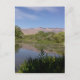 Bild tog över sjö med Sandia-bergen i bakgrunden. Klart, blå himmel.