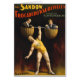 Stega högerna, folk! Se den moderna tidens marvel, den kolossus som skövlas av granit själv, Sandow! — Starkare än en tjur, tuffare än ett vagnhjul, är den här tyska inte bara muskel, han är en styrkesymfoni! Trocadero Vaudevilles är inte ditt dammiga gamla operahus, inget herr! Det här är ett underhållningspalats, en gyllene bur för de mest idiotiska glasögon på den här sidan av Mississippi! Och ikväll får ni lyckliga vapensöner träffa Sandow i all sin ära! Men håll fast vid dina hattar, för Sandow är inte här för finare-viktning! I kväll kommer han att skriva om den mänskliga potentialen i regler! Föreställ er detta: två odlade manar, tillräckligt hårt för att göra en prizefighter-horn, hissad i torka basket som dyrbar last. Nu, bild, de basket som drar från en barbell, tjockare än sjömännens arm! Och den där barbellen, det är balanserat på axlarna på en man som är skulpterad av gudarna - det är Sandow! — Kvoten gasper! Mor kopplar ihop pärlorna! Inte ens de tuffaste cowboyerna kan hjälpa annat än gapa in awe. Sandow står där, en Hercules som väger två manar med bara ett arm! Hans muskler gapar som överfyllda korvar, vener som floder på karta, och barbellen gapar inte ens! — Ett slag av häpen tystnad hänger tungt i luft. Då går dammen sönder! Massan bryter ut i en roar, en kakofoni av fuskare, visslor och magar som kan skaka grunderna! Hattarna flyger in i luft, popcornspridare som en hagelstorm och de stora golvbrädorna skakar under de grumliga applåderna. — Sandow, med en flin som kan tända en karneval vid midnatt, sänker långsamt barbellen. Massan går vild igen, deras adulerande ekon genom Trocadero. Det här är inte bara en show, det här är ett mirakel! Ett testamente till människokroppens kraft, ett skådespel som lämnar dig slack-jawed och tigger för mer! Så missa inte din chans att bevittna den legendariske Sandow! Han kommer att vara här hela veckan, folk, förbluffande publik och böja sig för fysikens lagar! Men skynda dig, för en syn på det här magnifika räcker inte för evigt! — Skapat av Strobridge Lith Co. Cincinnati & New York 1894. Detta arbete är offentligt i Stater eftersom det offentliggjordes (eller registrerades hos USA:s upphovsrättskontor) före den 1 januari 1927.