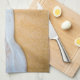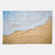 En kökshandduk med ett fotografi av en gyllenbrun sandstrand med vit skummande bränning.