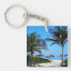 Havsvy med handflatan träd och sandstrand. Frond paraplyer på stranden bara perfekt för att slappna av under.