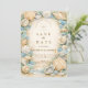 A refined coastal wedding design featuring an elegant oval wreath of seashells, oyster shells, starfish, and soft sea glass accents. Neutral sandy tones blend with muted ocean blues and delicate dune grasses to create a serene seaside aesthetic. The warm parchment background enhances the natural textures while maintaining a timeless, elevated feel. Perfect for a romantic beach celebration with classic coastal charm.