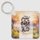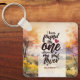 Nyckelkedjan med inspirerande citattecken skildrar en vacker naturbakgrund, inklusive en ängsskugga omgiven av träd. Den har en älskad bibelverse från Sång av Solomon 3:4, "Jag har hittat den som min själ kärlek."