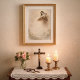 Katolsk andaktskonst föreställande St. Thérèse av Lisieux, Den lilla blommans, som varslar en regnskur av rosor från himlen medan en själ knäböjer i bön bredvid ett kors. Denna ömma bild speglar det löfte St. Thérèse gav att tillbringa sin tid i himlen med att göra gott på jorden och låta en regnskur av rosor falla som tecken på nåd.