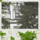 Den här bilden visar en digitalt stiliserad, nästan handskissad eller illustrerad vy av byggnaden Convent i Daylesford, delvis gömt bakom lush, tät löv. Arkitekturen är Victorian Gothic, med långa, trånga fönster och krånglig sten. Ett centralt torn stiger över träd, med ett röddömt tak. Det omgivande gröna ramar, byggnaden, ge det en hemlighetsfull, nästan förtrollad kvalitet. Den konstnärliga effekten gör att struktur blir roligare och att svarta konturer blir allt starkare. skapar scenen se drömmande ut som något ur en storybook eller ett minne.