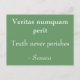 Ett vykort för mörkens mynta grönt med en latinfras och en engelsk översättning. "Sanningen är aldrig verklighet" är ett citat från Seneca, en romersk författare.