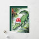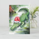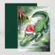 En akvarellillustration av en grön alligator som bär en tomtehatt. Alligatorn simmar i en bayou med grumligt vatten. Bakgrunden innehåller ett cypress-träd. Hela bilden har en mjuk, drömlik atmosfär.
