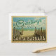 I Hälsning från Santa Barbara-vintage finns en sandig strand med vackra turkoshavet vatten och över havet, ett blå himmel med gigantiska vita moln. I vintage resor stil.