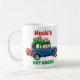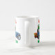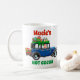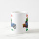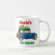 Kute personlig jul mugg med en bild av Jultomten i en gammal blå bil som levererar Julklapp. Texten säger "personlig namn" och "hett kakao".