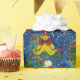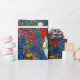 Färgfull, vismisk och konstnärlig akrylmålning till jul. Jultomten, snögubbskväll vinternatt med blommigt, prydnadsväxter för grönt, rött rosett band, hollbär, svamp, marionetter och leksaker i snö, av Bulgan Lumini (c)