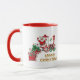 Kaffet eller teet mugg har ett jolly Jultomten som rider ett rött och vitt tåg med peppermint candy hjul som transporterar polkagrisar och brev till Santa med texten God jul i ljust guld.