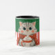 Charming cartoon Santa cat holding a cup of cocoa topped with whipped cream. Perfect for Christmas mugs, cards, and cozy gift collections.