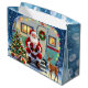 A cute whimsical Christmas gift bag with a woodland creatures theme. A deer and raccoon sit by Santa as he sips hot chocolate by his vintage RV camper.