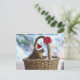 Foto av en ekorre som lite varstans ha på sig en Santa hattsitta i en basket med snö. Basketen har en ljus röd julpilbåge. Denna gulliga ekorrebild är en roligt långt som firar julhelgen och, kan lätt skräddarsy med din egna text på många olika produkter för jul.