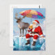 Tomten sipprar en öl på ett isberg under ett strandparaply med en av sina renar på en välbehövlig semester
