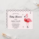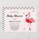 En flamingo-inbjudan till julbabydusch som visar en rosa flamingo i ett tomtskur som tittar på inbjudan ord med svarta hjärtdetaljer. Baksidan av inbjudan har en mönster av vita hjärtan på rosa. Anpassa ord, lägg till det i din vagn och ha en underbar babydusch. Santa Flamingo jul Baby Shower-inbjudan Holiday Design | ©Melissa Patton - Artist/Illustrator