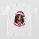 The image depicts a cartoon girl dressed as Santa Claus. The girl has long, wavy brown hair and large brown eyes. She wears a red hat with white trim and a pink decoration on the left side, a red dress with white trim on the edges, and red shoes. The background is black, highlighting the details of the girl and her attire. The cartoon design gives the image a playful and cheerful tone.
