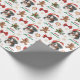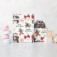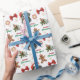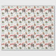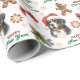 The repeated pattern on this Christmas wrapping paper includes an image of a Bernese Mountain Dog wearing a red and white Santa Claus hat. Also included in the pattern is a gingerbread man, a red bow, a holly sprig with red berries, and varied sizes of ornate gold snowflakes. Stylized red and green text says MERRY CHRISTMAS" and "HAPPY NEW YEAR". Be sure to see the many other products with dog images (and cats, too!) at Dog Village.