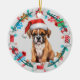 På framsidan av denna Helgdag är en bild av en söt brun och vit Boxervalp med en julhatt. Hund är inneslutet i en julandedräkt av inslagna ben, guld-stjärnor, paket och ljus. Baksidan av dekoratet har samma andedräkt med anpassningsbar i rött, guld och grönt. Byt enkelt år till ett namn för att anpassa det, om du vill.