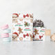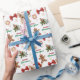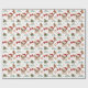The repeated pattern on this Christmas wrapping paper includes an image of an adorable Chihuahua dog wearing a red and white Santa Claus hat. Also included in the pattern is a gingerbread man, a red bow, a holly sprig with red berries, and varied sizes of ornate gold snowflakes. Stylized red and green text says MERRY CHRISTMAS" and "HAPPY NEW YEAR". Be sure to see the many other products with dog images (and cats, too!) at Dog Village.