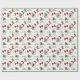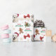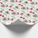 The repeated pattern on this Christmas wrapping paper includes an image of a beautiful Great Pyrenees dog wearing a red and white Santa Claus hat. Also included in the pattern is a gingerbread man, a red bow, a holly sprig with red berries, and varied sizes of ornate gold snowflakes. Stylized red and green text says MERRY CHRISTMAS" and "HAPPY NEW YEAR". Be sure to see the matching gift tags in our store.