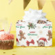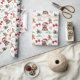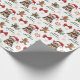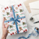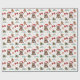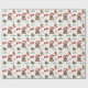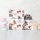 The repeated pattern on this Christmas wrapping paper includes an image of an adorable Yorkshire Terrier dog wearing a red and white Santa Claus hat. Also included in the pattern is a gingerbread man cookie, a red bow, a holly sprig with red berries, and varied sizes of ornate gold snowflakes. Stylized red and green text says MERRY CHRISTMAS" and "HAPPY NEW YEAR". Be sure to see the matching gift tags in our store.