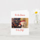 Det är dags att vara glad! God jul och en riktigt kul jul till dig från Santa Paws! Här syns en bullterrier som bär en julhatt med en julgran i bakgrunden