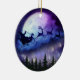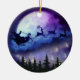 Den här fantastiska keramiska prydnadsprodukten har en silhuettillustration av Jultomten i en magisk slirtren, som flyger i den månbelysta natten över julskogen, den stora lila måne med kratrar, blå och lila moln och stjärnor.