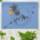 Modern ord-konst har kaliforniska i ett grått-typsnitt med Santa Monica i ett modernt, vitt typsnitt med geometriskt handflatan och bergar logotyp stil-grafik på blå bakgrund