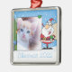 En leende Jultomten tecknad figur står bredvid ett "ram" för ditt foto. Det finns en blå och vit vinterbakgrund. Du kan ändra teckensnittet stil och storlekt om det behövs.