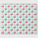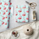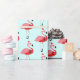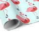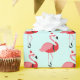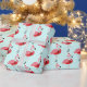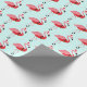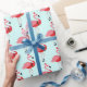 Noveltyns julomslutning papper med en mönster av rosa flamingos i tomten på blå bakgrund.