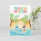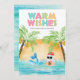 Det tropiska julkortet "Warm Önskemål" har jultomten och en sjöjungfru som simmar i havet vid solnedgången, inramat av ett par handflatan träd som är utslitet i sträng ljus. Tomten sipprar en cocktail ut ur en ananas och blinkar hawaiianska alhaskylten. Art av KL Lagrar.