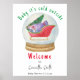 Baby Shower-inbjudan med ett vackert vattenfärgssläde med gåvor i ett glas boll. Vinterbabyskor. Julgran, väska med gåvor från Jultomten. Tema för julbabyduschen.