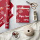 Modern, cute, elegant personalized Christmas gift wrap for kids, with a unicorn (with a red-and-golden mane and tale) pulling Santa's sleigh; the greeting "Merry Christmas" in stylish typography; and a personalized name. On a Xmas red background, with many cute, festive snowflakes.