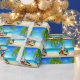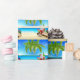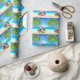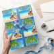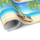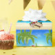 Santa julillustration. Santa som kopplar av in på stranden under palmträd med surfa, stiger ombord, plundrar presenter och annan helgdagobjekt med en tropisk drink och att ha på sig stiga ombord kort och bläddra misslyckandesandals.