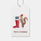 En ekorre med en röd och grönt julhatt håller en röd fullt av presenter på dessa söta Juletiketter.